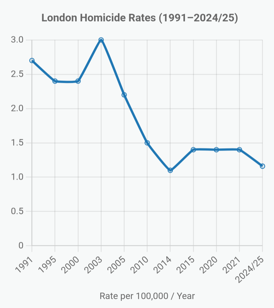 Overall Crime.In summary, despite media focus on recent rises, the data substantiates London as safer overall - fewer homicides, robberies, and victimisations per capita than 20–30 years ago, thanks to targeted policing, economic growth, and tech (e.g., CCTV).5 -