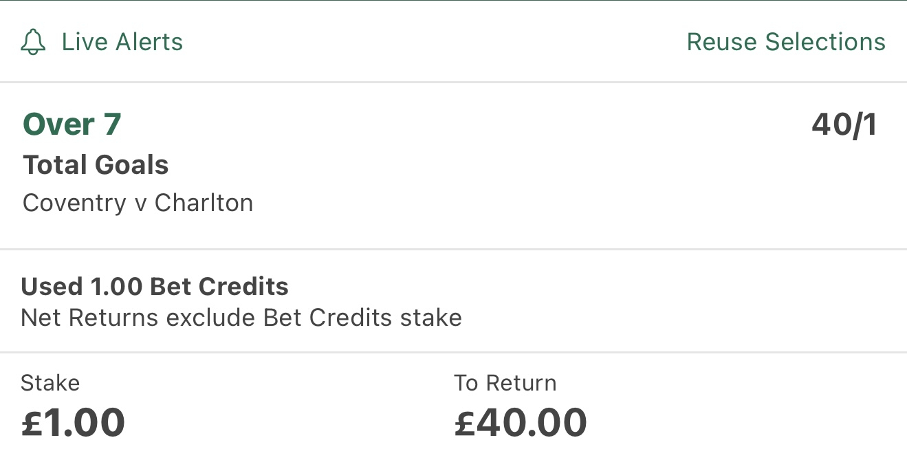 Coventry to score four or more ( Home unquoted on correct score market ) is 6.5  (11-2) on the betfair exchange. No Brainer.