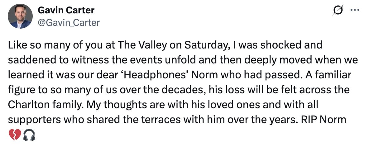 Like many I only knew ' headphones Norm' to nod to at away games but I cannot get over how empty I feel, I really aren't bothered about the game tomorrow,