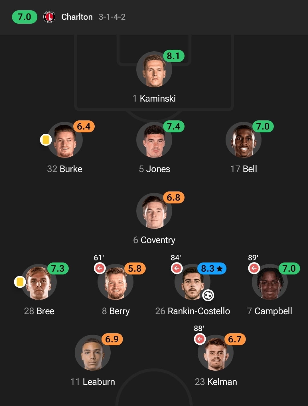 kelman also great.Surprised leaburn didnt come off as was holding his hamstring early into second half and, i thought, was generally ineffective.10 -