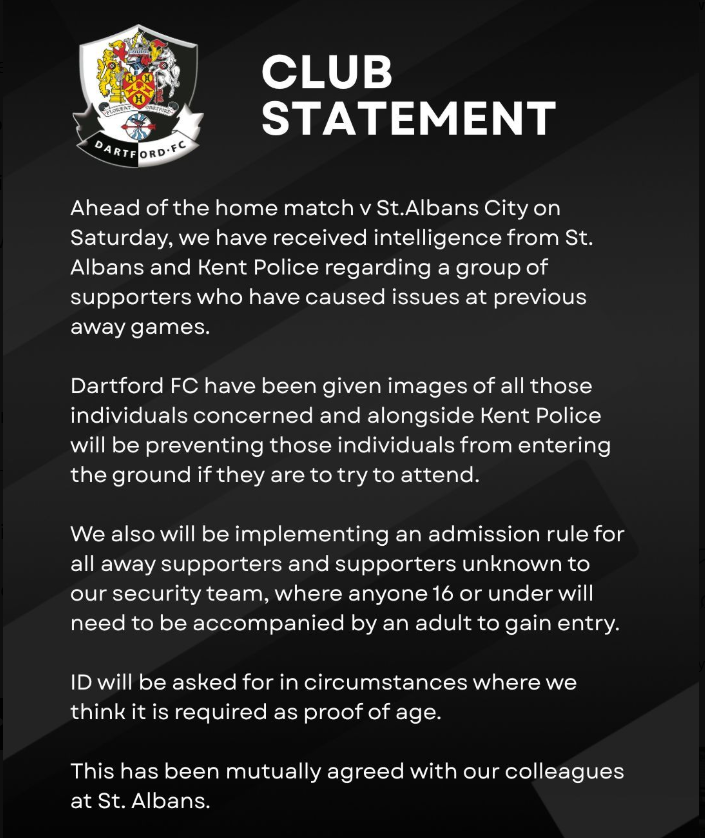 Misbehaving under 16s causing aggro seems to be the problem. I'd forgotten about it, but I had been to Dartford's game at St Albans earlier in the season, and a small group of Dartford yoof stayed down the "home end" instead of swapping ends at half time, resulting in some aggro in the second half.Arsenetatters said: