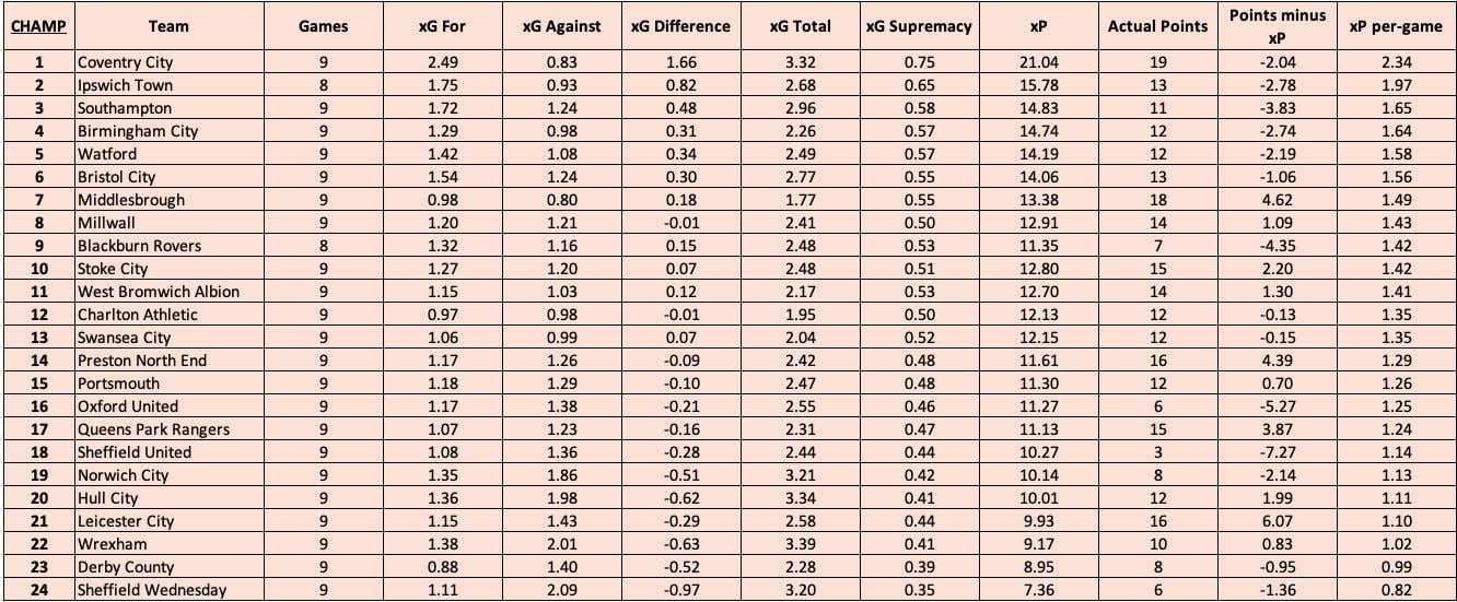 9 games in update. We are bang average, which is obviously great for our first season back at this level.Biggest concern is obviously chance creation, our xG for is only better than Derby’s. Defensively we are the 5th best though6
