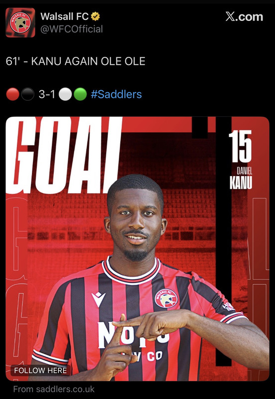 "Goal! Walsall 3, Tranmere Rovers 1. Daniel Kanu (Walsall) right footed shot from the centre of the box to the bottom right corner. Assisted by Connor Barrett following a fast break."  BBC