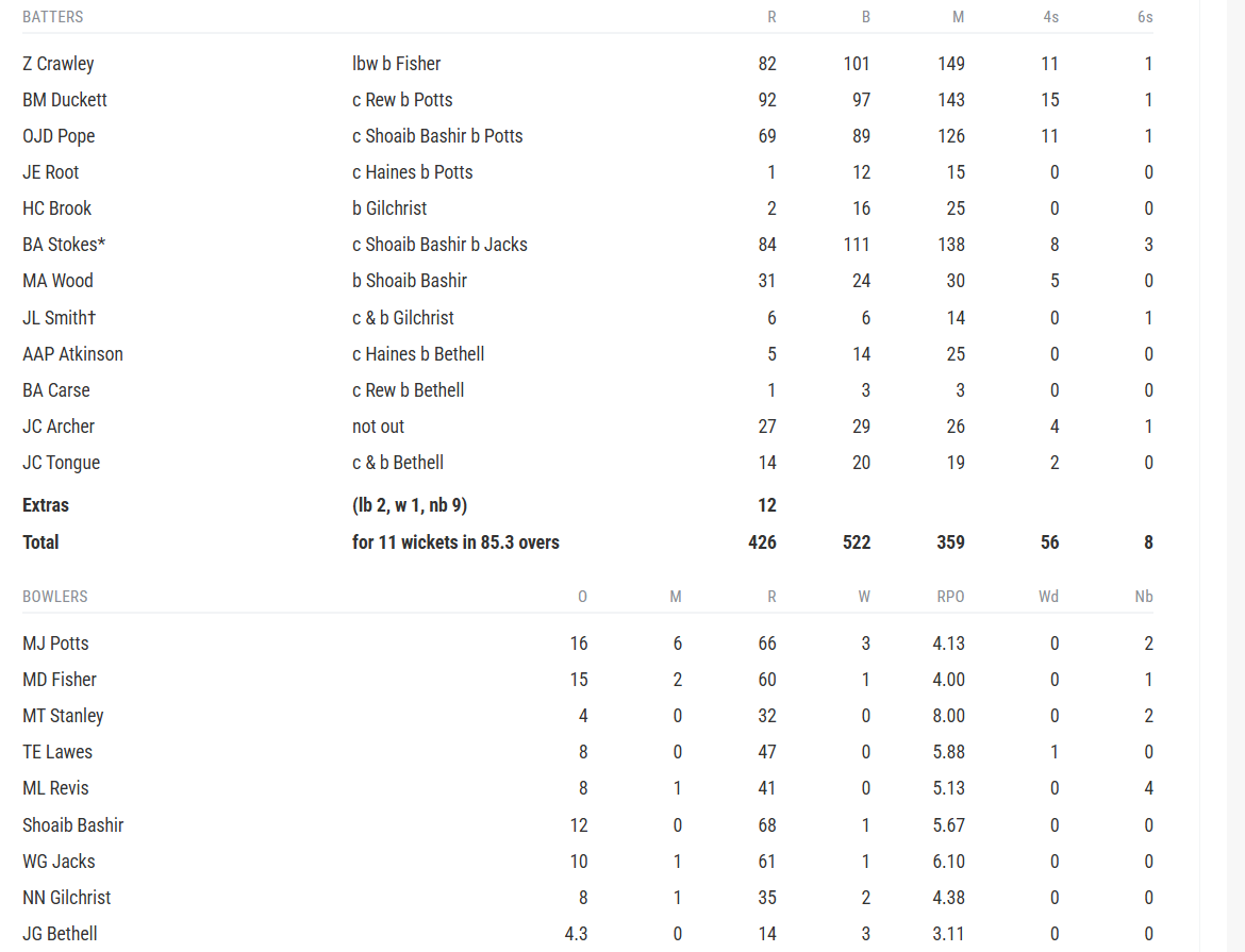 Just to be clear this was 17-year-old Thomas Rew that hit 55 and who will keep and not his older brother, James. They are a really talented pair but quite why James, who is in the Lions squad and who was called up for the England squad in the summer, was left out I do not know. Equally, the fact that Cox hasn't taken the gloves suggests that he still hasn't got over his finger issues in which case he won't be the next on the block should Smith or Pope get injured.Addick Addict said:Well this is confusing. They've substituted Rew for Lawes on the scorecard with Atkinson bowling Rew for 55. Then Stokes gets Lawes out for a duck for his fifth wicket. Knew that stand between the "Surrey boys" was fake news.1 -