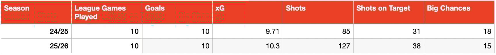 Thought I'd bring this back now we're at 10 games. Apart from the fact we're taking a lot more shots, and getting them on target a bit more, everything else is remarkably similar3 -