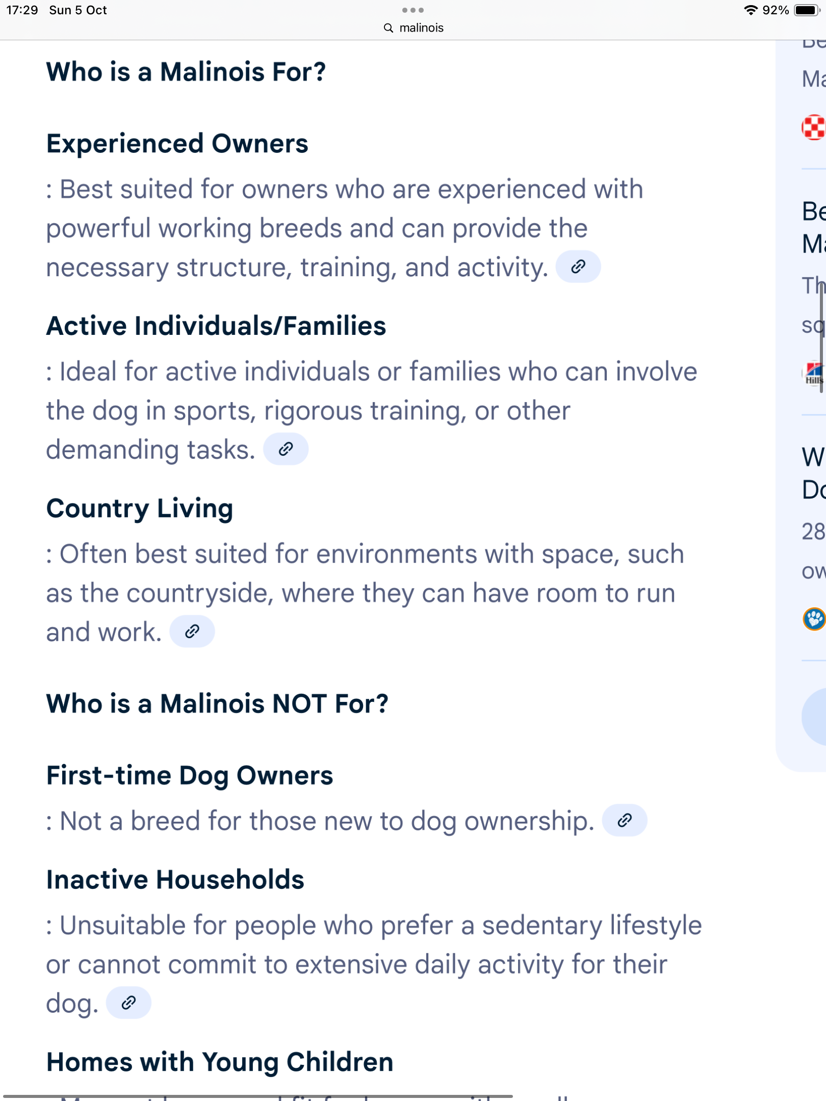 • Malinois are amazong creatures, so, so clever too much so for their own good sometimes! Sadly as much as I have given homes to rescue dogs and am experienced but out of practice with dog ownership, I would not consider rehoming a Mallinois as much as I adore the breed. They need training from birth almost and like with all breeds, you have to be the boss. And if one of those doesn't want you to be their boss they will win the argument.