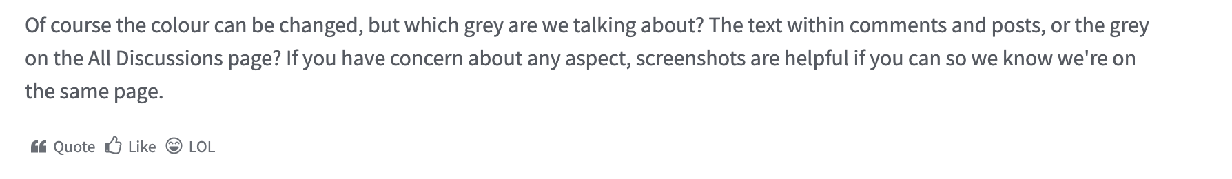 Of course the colour can be changed, but which grey are we talking about? The text within comments and posts, or the grey on the All Discussions page? If you have concern about any aspect, screenshots are helpful if you can so we know we're on the same page.