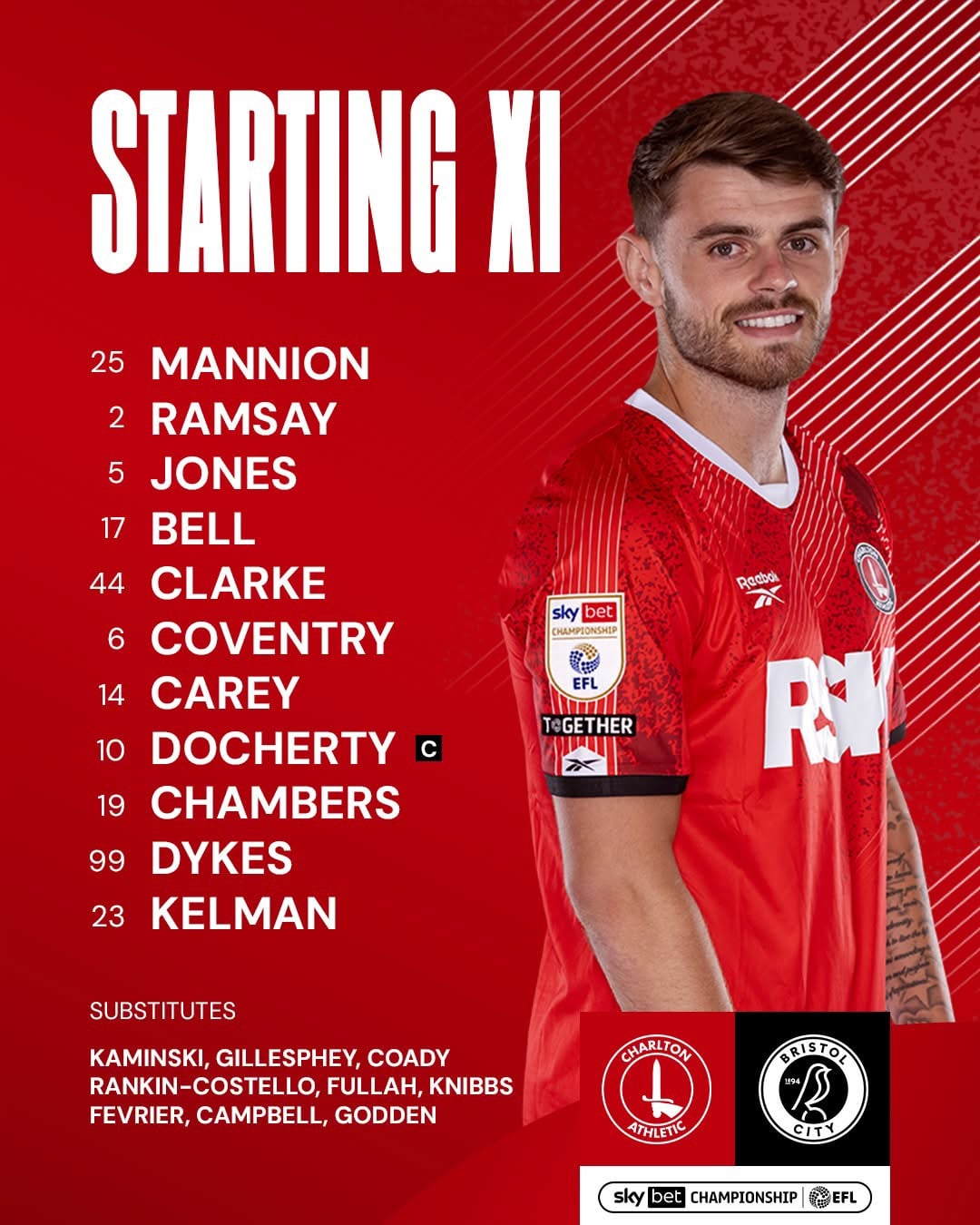 TEAM…Charlie Kelman returns to the starting line-up for this afternoon’s game against Bristol City at The Valley (KO 3pm BST).